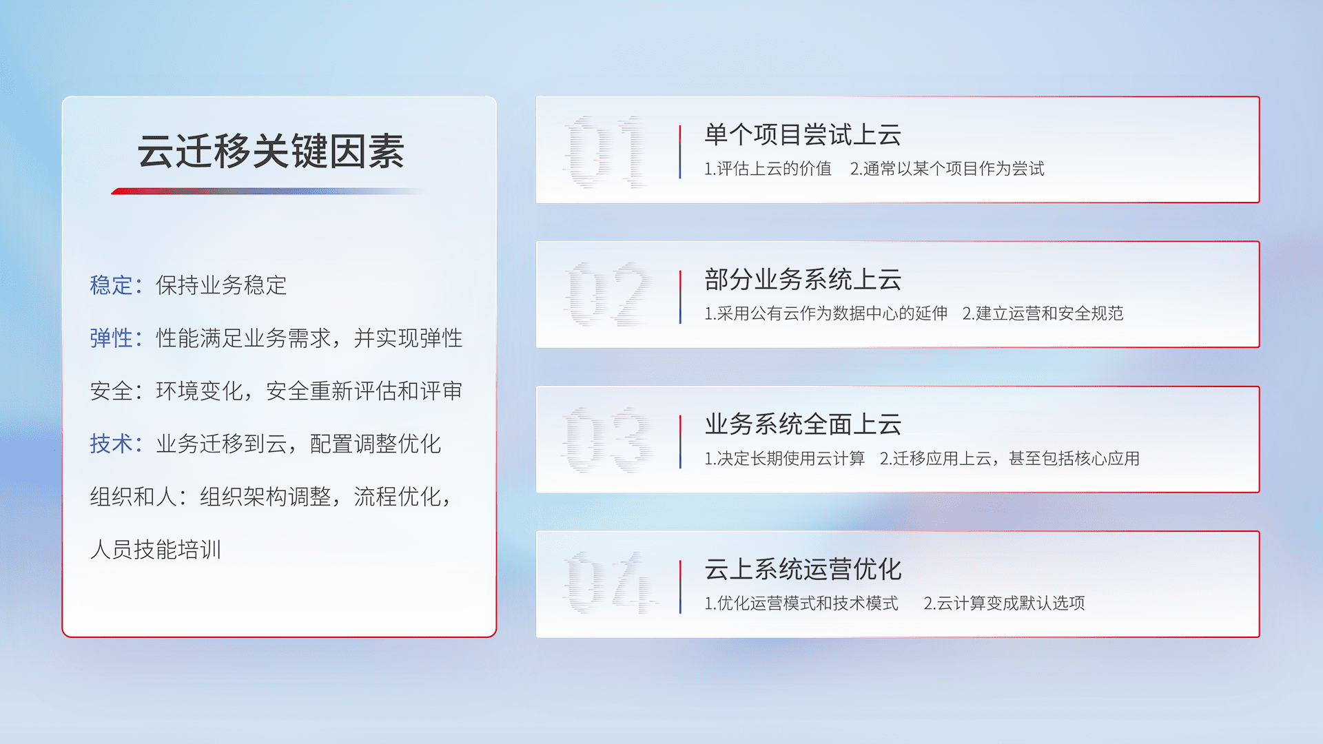 结合实际业务,,,从规划设计、、、云平台选型、、、、云原生改造、、数据迁移、、、集成交付,,,,迁移全过程为客户识别最佳上云路径,,,,做好风险识别管理,,,设计网络架构、、、、身份权限、、、安全审计合规、、、操作审计、、、日志审计、、监控告警策略、、、、多站点容灾设计等,,,对云上基础设施进行整体规划,,,,提升IT治理水平,,,以满足弹性、、、、高可用、、、高性能的需求。。。