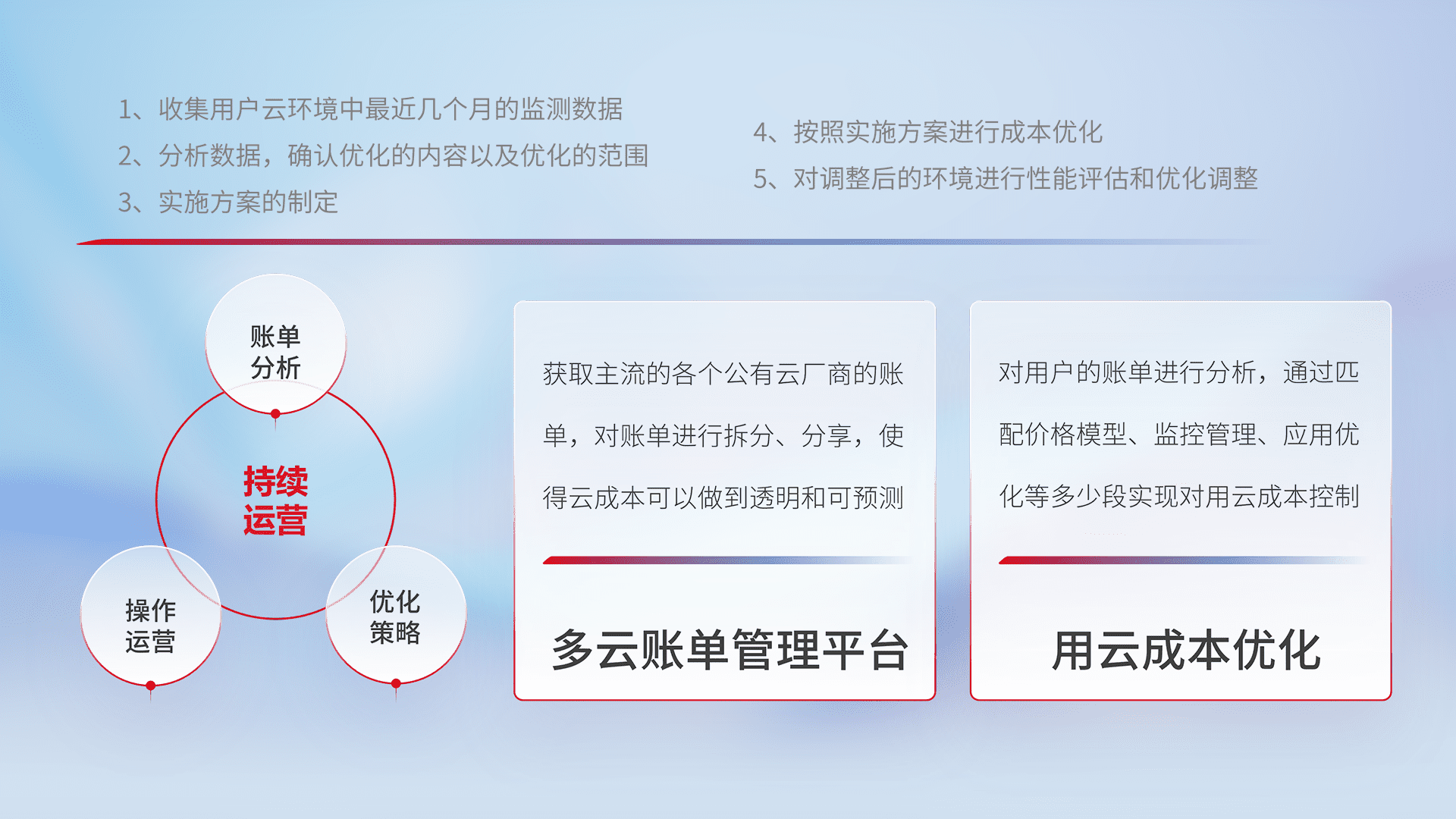 通过多云纳管,,以统一的资源数据模型把客户的云资源进行抽象和封装,,,进而实现对多云资源的统一操作,,保障云资源管理的可靠性、、、稳定性与可用性。。。。量身定制化运维内容,,,配置、、、、开发运维、、、、补丁管理、、、、备份、、、监控、、、认证和访问管理、、、、审计和日常巡检等,,,保障在用云过程中的可靠度,,,,稳定度以及高可用率。。。